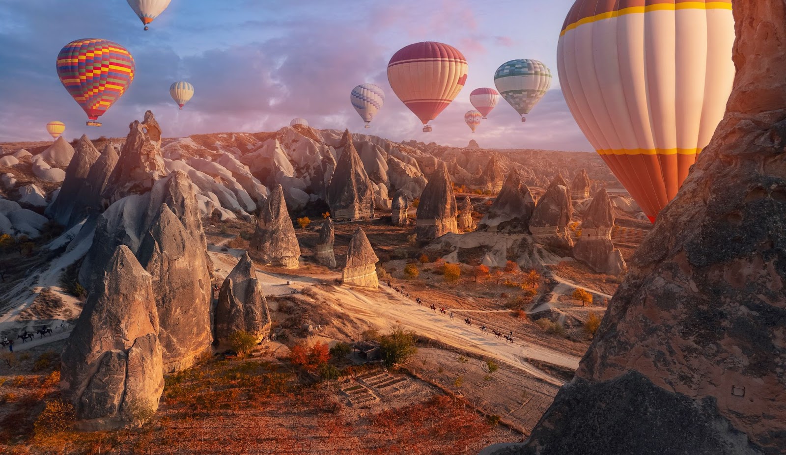 In autumn, the Fairy Chimneys of Cappadocia lose the harsh glare of the summer sun. The valley floors are filled with vineyards and apricot trees that turn a soft yellow.